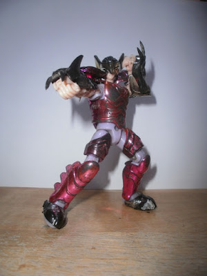 Como se puede ver, la armadura está en un estado bastante lamentable... es la más desgastada de todas las armaduras KO que tengo y es obvio debido a que jugué mucho con él. Pero lo importante es todas las piezas están completas (la verdad no les tenía mucha confianza a los blisters piratas). Al igual que sus compañeros de Asgard, las bisagras en la coraza fueron reemplazadas por pequeños pines con agujeros que no afectan para nada a la hora de ensamblar el Object. Las piezas son firmes y quedan bien puestas salvo en el hombro derecho que está flojo y se sale fácilmente, aunque esto es más problema del hombro del muñeco que de la hombrera.